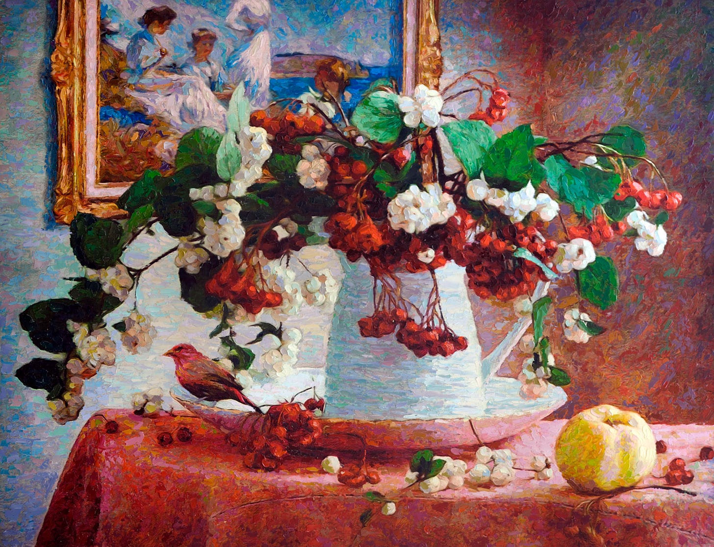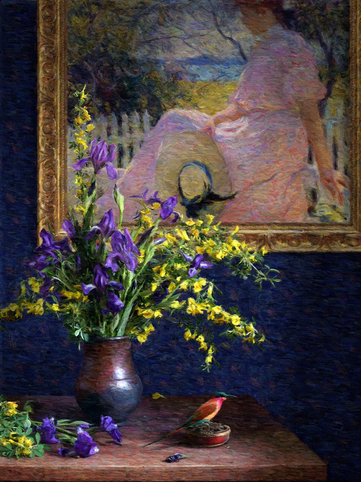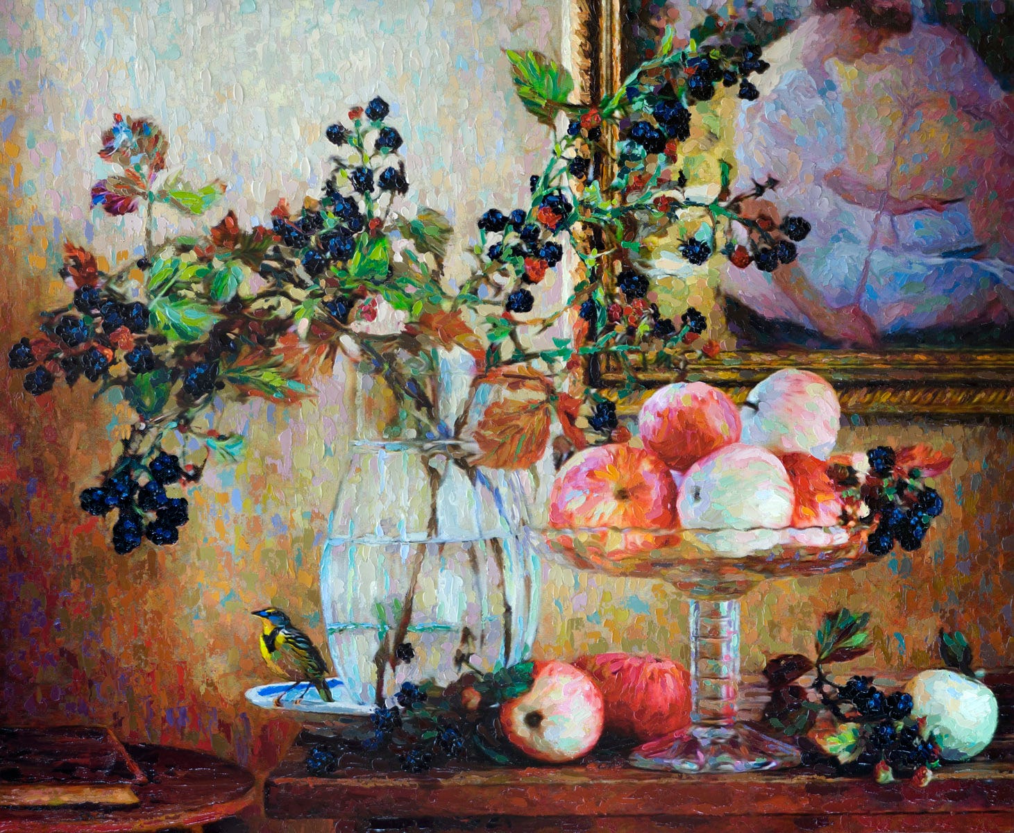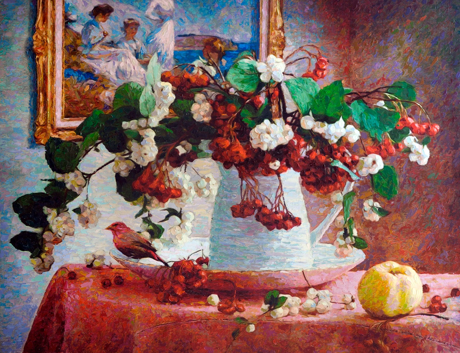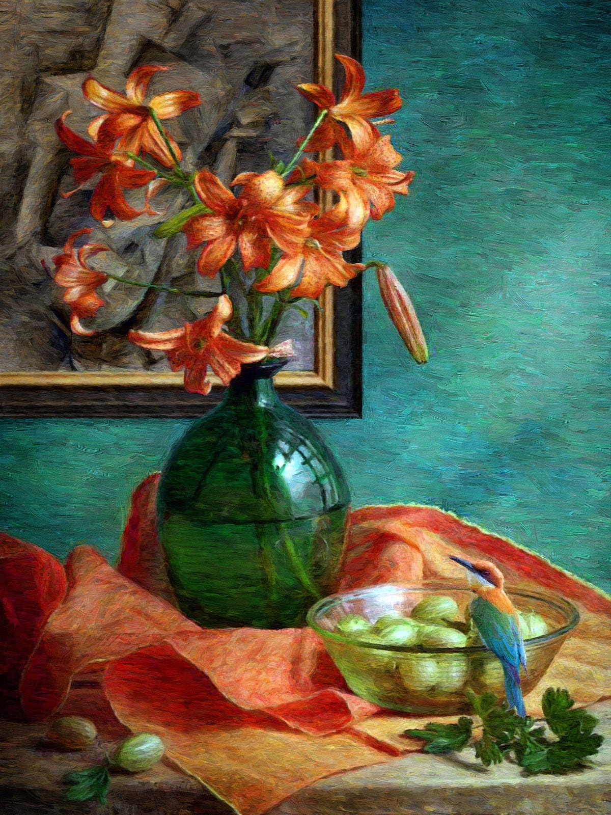 A still-life series composed of fruit and flowers, ceramic and glass containers with a bird as the central figure, all supported by a well-known artist's work hanging on the wall behind it.