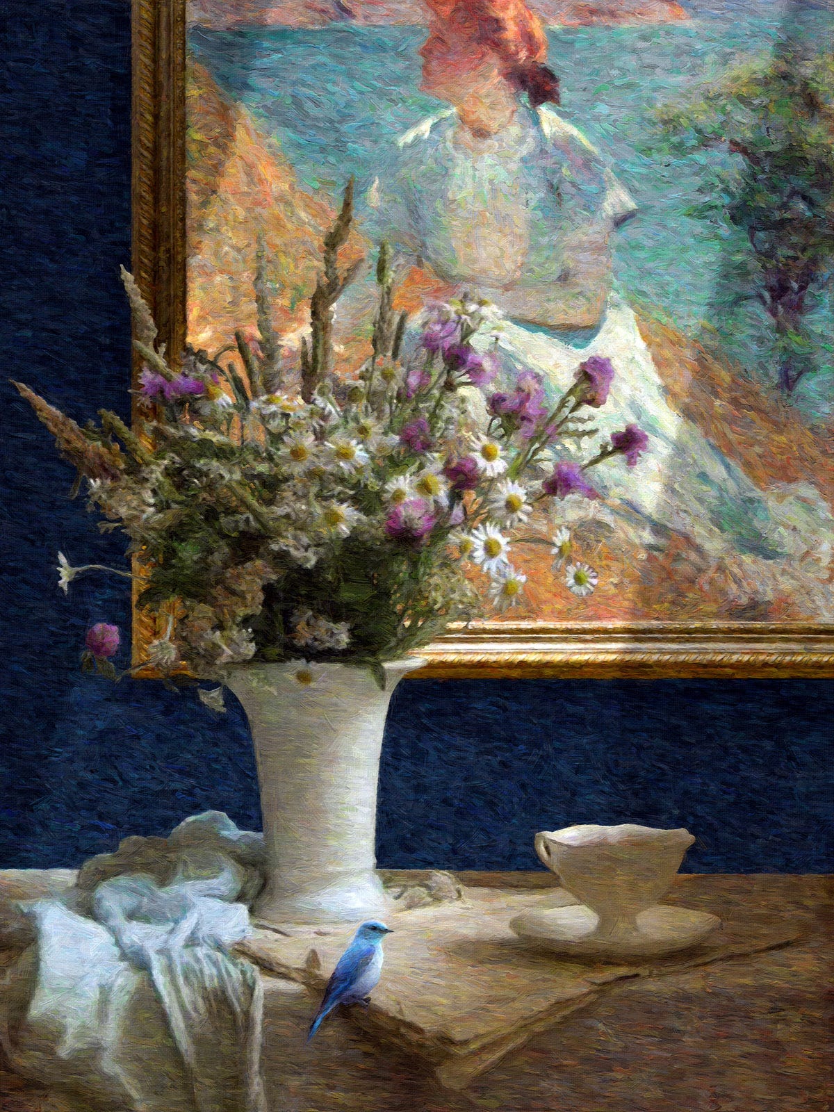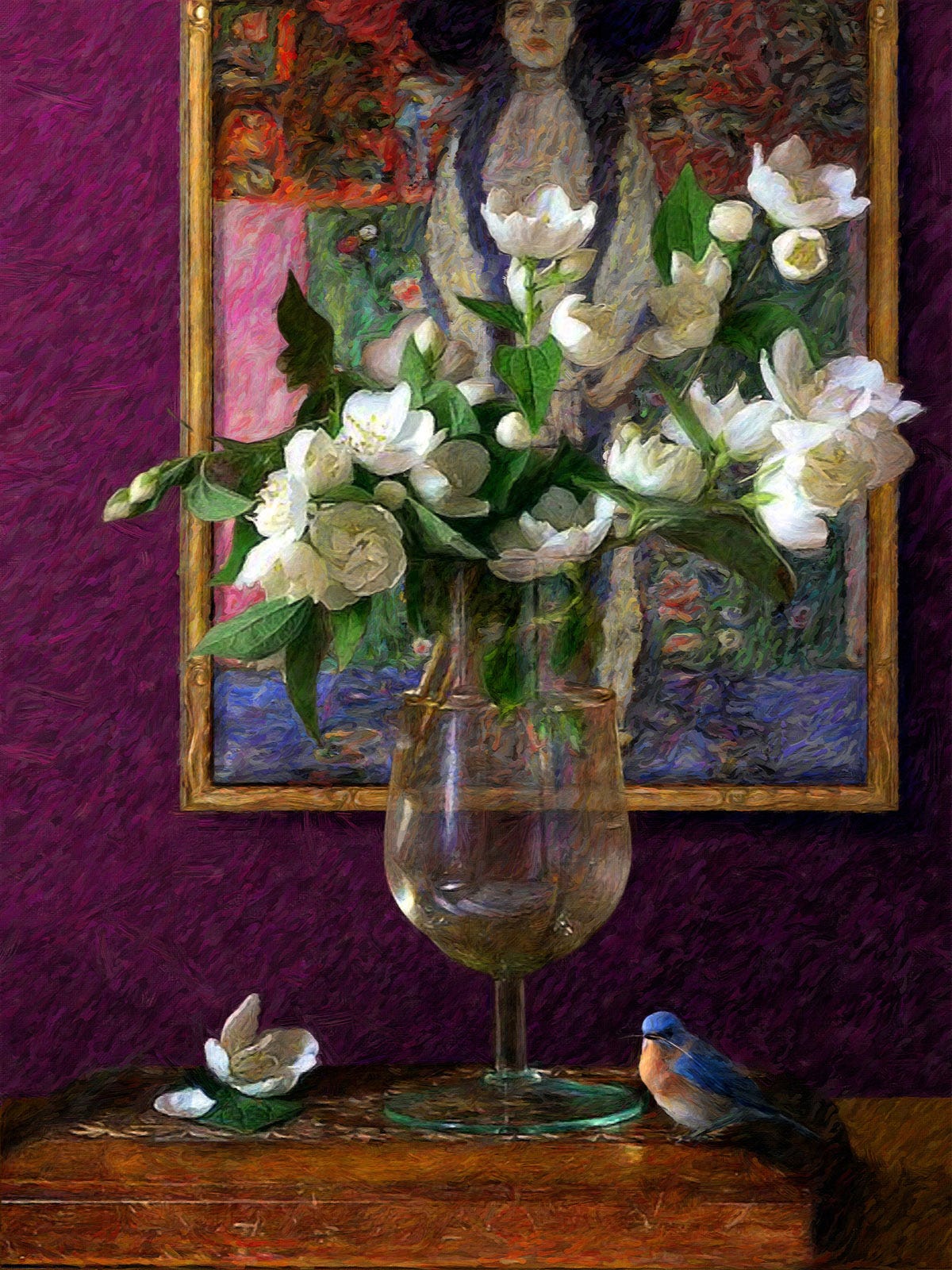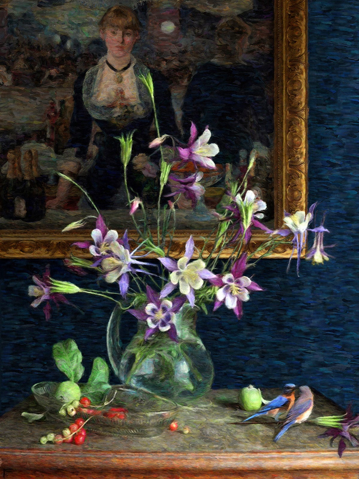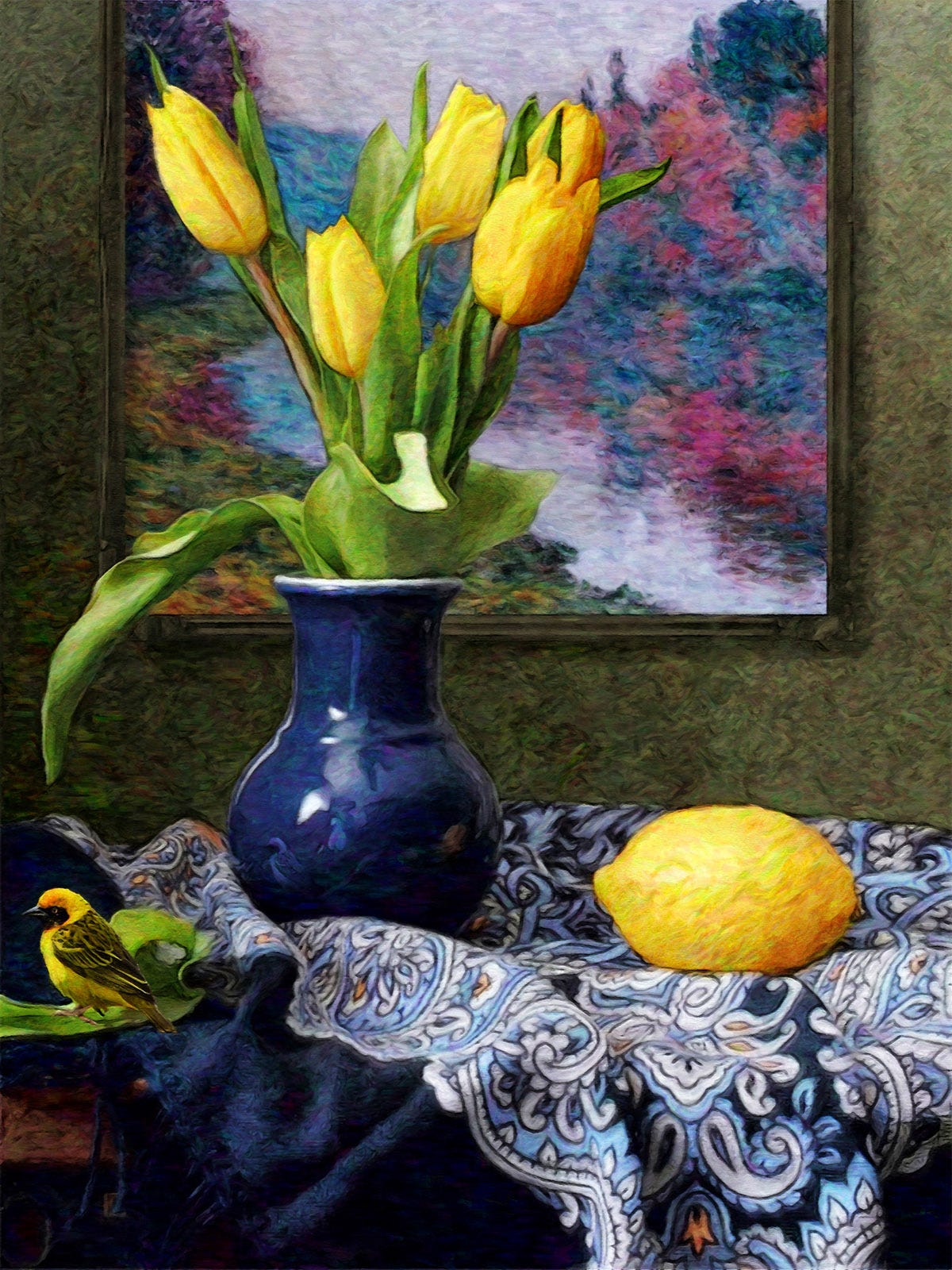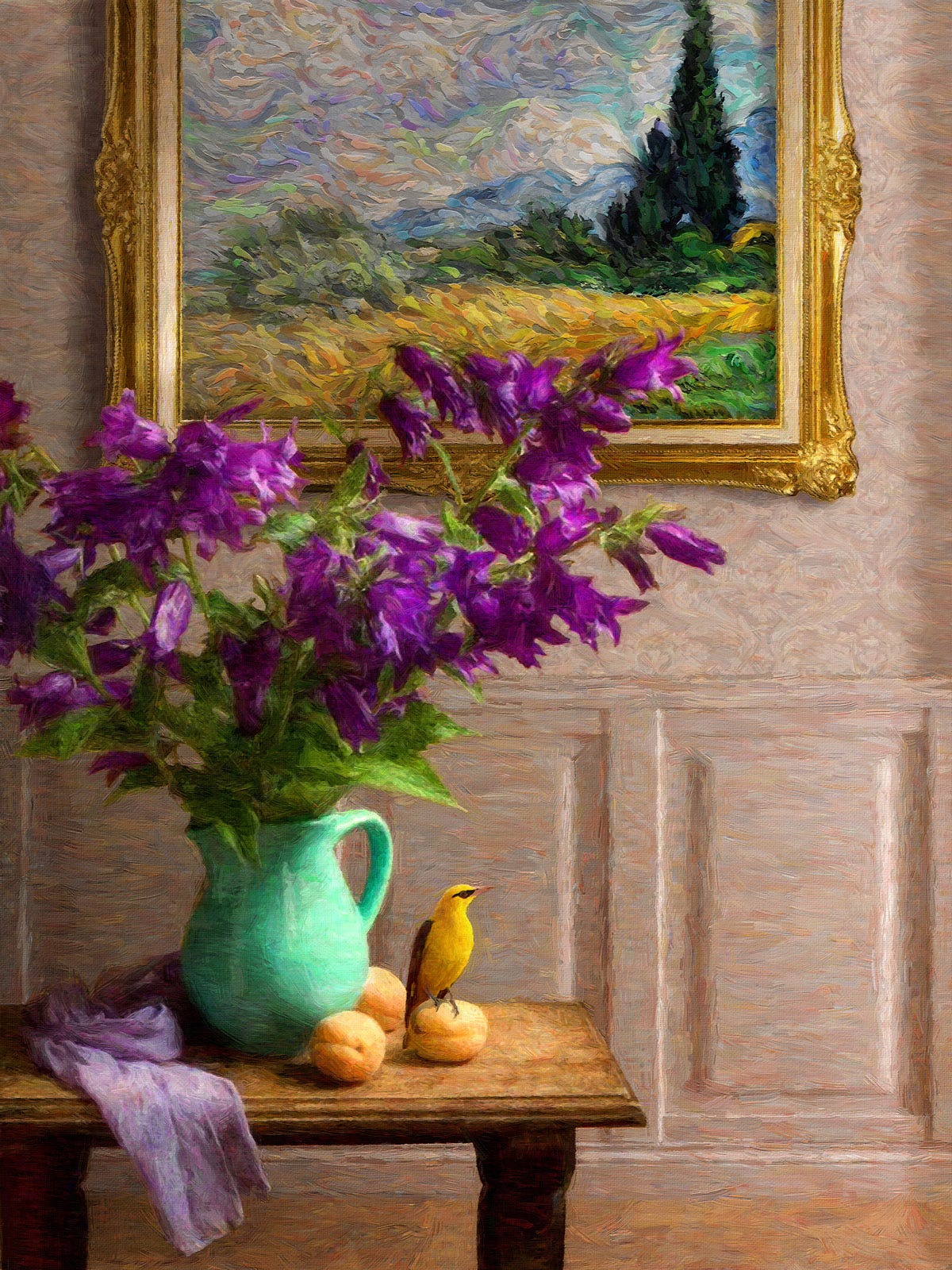 A still-life series composed of fruit and flowers, ceramic and glass containers with a bird as the central figure, all supported by a well-known artist's work hanging on the wall behind it.